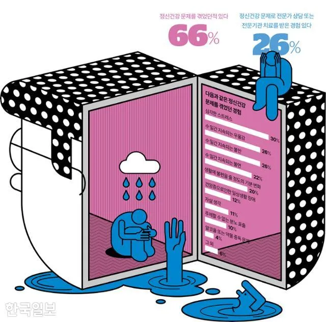 한국리서치가 1월 9일부터 12일까지 전국 만 18세 이상 1,000명을 대상으로 실시한 정신건강 인식 조사에서 응답자의 66%가 평생 한 번 이상 정신건강 문제를 경험했다고 밝혔다. 가장 많이 경험한 문제는 심각한 스트레스(30%)이며, 우울감과 불안이 각각 26%로 뒤를 이었다. 정신건강 문제 경험이 증가했음에도 전문가 상담이나 치료를 받은 응답자는 26%에 그쳤다. 신체적 통증이 2주 이상 지속될 때 병원을 찾겠다는 응답이 44%인 반면, 우울감이나 무기력이 2주 이상 지속될 때 전문가를 찾겠다는 응답은 32%로 낮았다. 정신적 어려움을 주변에 이야기하는 것이 자연스럽다는 응답은 37%에 불과했으며, 정신건강 문제 노출 시 직장·학교에서 불이익을 받을 수 있다고 생각하는 응답은 83%에 달했다. 10년 후 정신건강 문제를 겪는 사람이 지금보다 늘어날 것이라는 응답은 79%로, 신체건강 문제 증가 전망(64%)보다 높았다. 정신건강 심리상담 바우처에 대해 43%는 전혀 들어본 적 없다고 답했으나, 60%는 해당 바우처를 이용할 의향이 있다고 밝혔다.