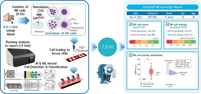 고려대학교 세종캠퍼스 공동연구팀이 2025년 9월 ㈜메타이뮨텍이 개발한 'Cellytics® NK' 플랫폼을 활용해 혈액암·골수이식 환자 등 면역저하 환자의 NK(Natural Killer) 세포 특성을 세계 최초로 규명했다. 이 플랫폼은 렌즈프리 그림자 이미징 기술(LSIT) 기반으로 환자 혈액에서 NK 세포를 신속하게 분리하고 손상 없이 분석한다. 연구팀은 독창적 지표인 CSP와 새롭게 정의한 선천면역지수(I³)를 통해 건강인과 면역저하 환자를 정확히 구분할 수 있음을 입증했으며, 특히 CSP는 AUC 0.95 이상의 높은 진단 성능을 보였다. 이 기술은 기존 NK 기능 평가의 복잡하고 시간이 오래 걸리는 단점을 극복하고 실시간 면역 상태 측정을 가능하게 했다. 이번 연구 결과는 장비·계측 분야 최고 영향력 지수를 가진 국제 학술지 'Sensors and Actuators B: Chemical'에 게재되었으며, 암 치료, 감염병 대응, 개인 맞춤 의료 등 다양한 분야에 활용될 수 있을 것으로 기대된다.