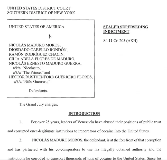 마두로는 2020년 3월 마약 밀매와 돈세탁 혐의로 기소된 상태다. 미 정부는 마두로 일가와 측근들이 테러 조직으로 지정된 콜롬비아 옛 반군조직 FARC 및 마약 카르텔과 연계해 대규모 코카인을 미국으로 밀반입했다고 보고 있다.
