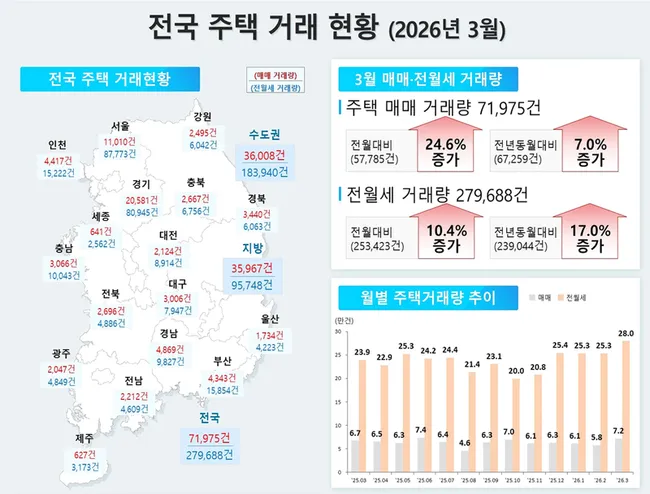수도권 매매는 3만6008건, 지방은 3만5967건으로 나란히 증가했으나 서울 아파트 매매는 전년동월 대비 31.2% 감소했다. 월세 거래가 36.3% 증가하며 전체 전월세의 68.6%를 차지했다.