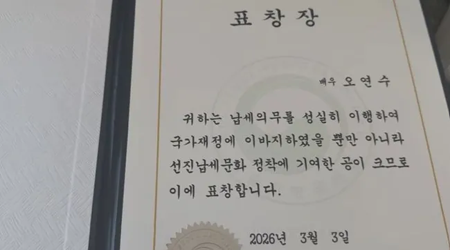 배우 오연수가 2일 제60회 납세자의 날 기념식에서 지방국세청장 표창을 받았다. 오연수는 지난달 3일 열린 기념식에 참석해 수상했으며, 유튜브 채널에 수상 과정을 공개했다. 표창장에는 '납세 의무를 성실히 이행하여 국가재정에 이바지하였을 뿐만 아니라 선진납세문화 정착에 기여'했다고 기재됐다.