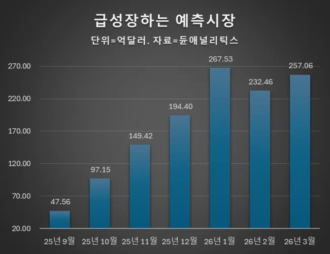 미국·이란 전쟁 등 지정학적 갈등과 미국 정치 이벤트를 중심으로 예측시장이 급성장하고 있다. 지난달 명목 거래대금은 257억달러를 기록해 6개월 전 47억달러 대비 440% 증가했으며, 바이낸스가 프레딕트닷펀 서비스를 출시하며 세계 최대 거래소까지 시장에 진출했다.
