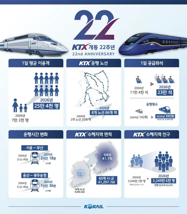 KTX는 2004년 경부선과 호남선 20개 역에서 출발해 현재 8개 노선 86개 역으로 확대됐으며, 수혜지역 인구는 3250만명으로 국내 인구의 63.6%에 달한다. 코레일은 '지역사랑 철도여행' 등을 통해 지역 균형 발전을 추진하고 있다.