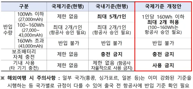 국토부는 지난해 1월 에어부산 화재 사고를 계기로 보조배터리 안전대책을 시행해 왔으나, 국제기준 부재로 국가별·항공사별 규정이 상이해 국제선 이용객의 혼선이 발생했다. ICAO는 3월 27일 항공위험물운송기술지침에 보조배터리 반입 수량 및 충전·사용금지 규정을 신설하고 안전 기준을 대폭 강화했다.