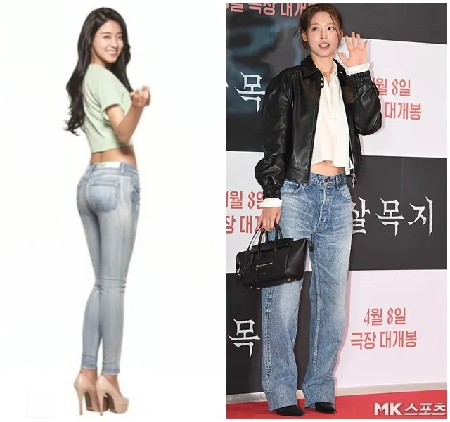 과거 설현은 스키니진 광고로 '뒤태 여신', '청바지 아이콘' 수식어를 얻으며 입간판 열풍을 일으켰다. 당시 몸매를 강조한 밀착 핏이 상징적이었다.