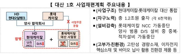 정부가 23일 HD현대케미칼과 롯데케미칼의 대산 석유화학단지 통합 사업재편계획을 승인했다. 롯데케미칼 NCC 설비(연산 110만톤) 가동을 중단하고 양사 다운스트림 설비를 축소한다. 두 회사는 통합법인에 각각 6000억원씩 총 1조2000억원을 증자하며 지분구조를 5대5로 조정한다.