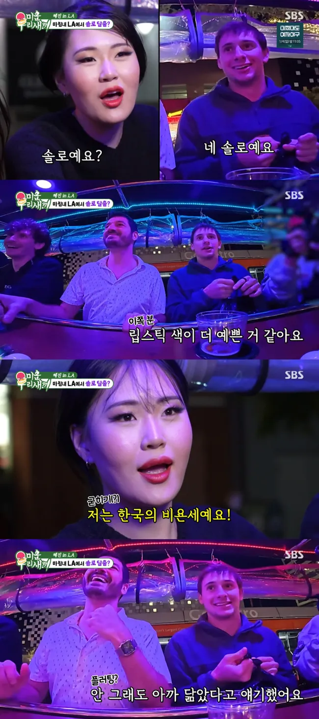 한혜진과 함께 이동식 바에 올라탄 엄지윤은 마주 앉은 남자들에게 호감을 보였으며, 관심을 보인 남자가 먼저 말을 걸어왔다. 엄지윤은 '한국의 비욘세'라며 자신의 매력을 표현해 현장의 분위기를 밝혔다.
