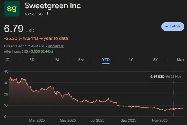 스위트그린은 2007년 조지타운 대학교에서 시작해 2021년 상장 당시 시가총액 56억 달러를 기록했으나, 올해 들어 주가가 80% 가까이 하락했다. 3분기 연속 기존 지점 매출이 감소했으며 최근 9.4% 급락했다. 전문가들은 공격적 확장 과정에서 메뉴 품질이 떨어진 것을 주요 원인으로 꼽았다.