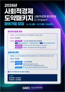 경기도사회적경제원이 사회적경제조직 투자유치 지원 프로그램 '2026년 사회적경제 도약패키지'를 4월 21일부터 5월 7일까지 모집한다. 올해는 투자 연계 기능을 강화해 '투자유치 집중'과 '실증지원' 두 개 트랙으로 분리 운영한다.