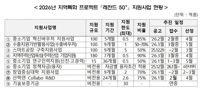 중소벤처기업부가 28일 17개 광역자치단체와 함께 추진하는 '2026년도 지역특화 프로젝트 레전드 50+ 지원사업' 통합공고를 실시한다고 밝혔다. 지자체가 지역 주력산업과 연계된 성장 가능성 높은 기업을 추천하면 중기부가 정책수단을 연계·집중 지원하는 지역 주도형 기업 육성 프로그램이다.