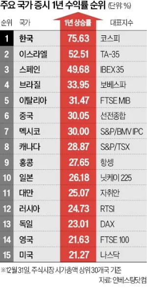 한국 코스피지수가 2025년 75.6% 급등해 글로벌 주요국 가운데 압도적인 상승률 1위를 차지했다.