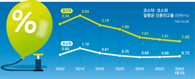 국내 증시의 극심한 변동성 속에서 개인투자자들의 신용거래 강도를 나타내는 신용잔고율이 역대 저수준으로 하락했다. 코스닥시장의 신용잔고율은 6일 1.42%로 2021년 8월 고점 2.82%의 절반 수준이며, 코스피도 0.72%로 2020년 이후 평균에 못 미치는 상태다.
