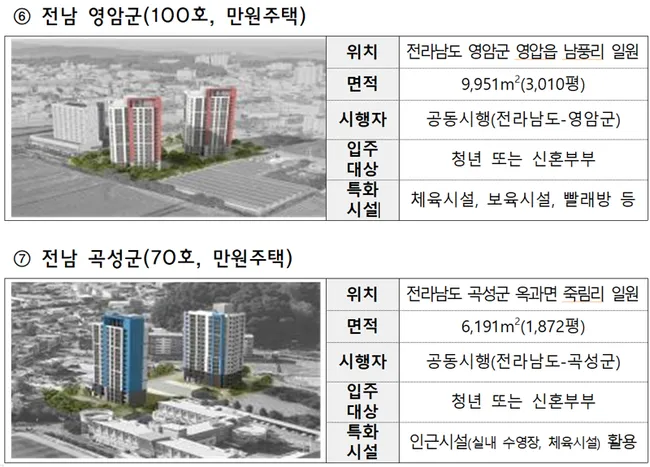 특화주택은 청년, 고령자, 신혼부부 등 특정 수요자를 대상으로 주거공간과 함께 사회복지시설, 돌봄공간, 공유오피스 등 지원시설을 제공하는 공공임대주택이다. 경기도는 신혼부부와 양육가구 대상 2건(2686가구)을 공급하며 개방형 양육지원시설을 조성하고, 전남권은 월 1만원에 거주 가능한 '전남형 만원주택' 등 8건(590가구)을 선정했다.