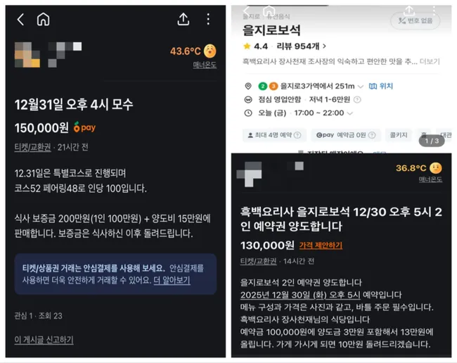 연말을 맞아 인기 파인다이닝과 호텔 예약이 중고거래 플랫폼에서 웃돈을 얹어 거래되는 사례가 급증했다. 미슐랭 3스타 레스토랑 '모수' 예약은 양도비 15만원, '을지로보석'은 양도금 3만원이 추가되는 식으로 정상 가격 외에 수십만 원대의 추가 비용이 발생하고 있다.