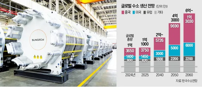 중국은 태양광·전기차·배터리에 이어 수소산업을 탈탄소 전략의 핵심으로 낙점하고 공격적으로 생태계를 확장 중이다. 선그로 등 중국 기업들은 수전해 설비 생산과 그린철강 제철 등으로 수소 가치사슬을 수직계열화하고 있으며, 정부는 신규 재생에너지 발전소의 20% 수소 생산 의무 할당과 전력망 이용료 면제 등으로 원가 경쟁력을 확보하고 있다.
