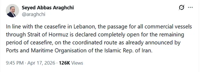 이란이 이스라엘-레바논 10일 휴전 발효에 맞춰 호르무즈해협 상선 통행을 전면 허용했다. 아라그치 외무장관은 휴전기간 동안 지정 항로를 통한 모든 상업 선박의 항행을 개방한다고 선언했다.