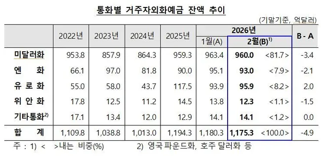 지난 2월말 기준 국내 외국환은행의 거주자외화예금 잔액은 1175억3000만달러로 전월 대비 4억9000만달러 감소했다.