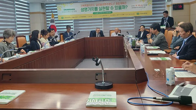 전북생명평화포럼 등 9개 시민·환경단체는 16일 전북도의회에서 정기포럼을 열고 전북도의 최상위 법정 계획인 '글로벌생명경제도시 종합계획'을 검증했다. 도는 지난달 20일 현대자동차그룹의 9조원 투자 유치 등을 포함한 중·단기 발전 전략을 확정·고시했으나 도민 공감대와 공론화는 실종됐다는 지적이 나왔다.
