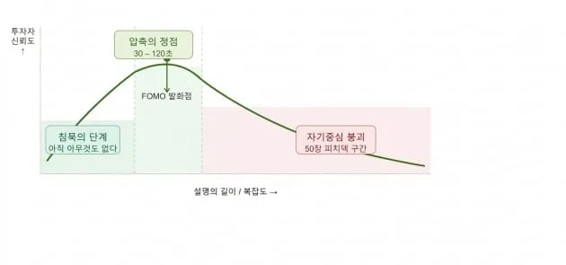 투자 피치는 길고 상세할수록 투자자의 심사 모드를 작동시켜 반론을 유발한다. 인지과학자 카너먼의 연구에 따르면 인간의 의사결정 95%는 빠른 직관(시스템 1)에서 이뤄지는데, 장황한 자료는 느린 분석(시스템 2)을 강제해 투자자의 뇌를 '비전 감지'에서 '허점 찾기' 모드로 전환시킨다.