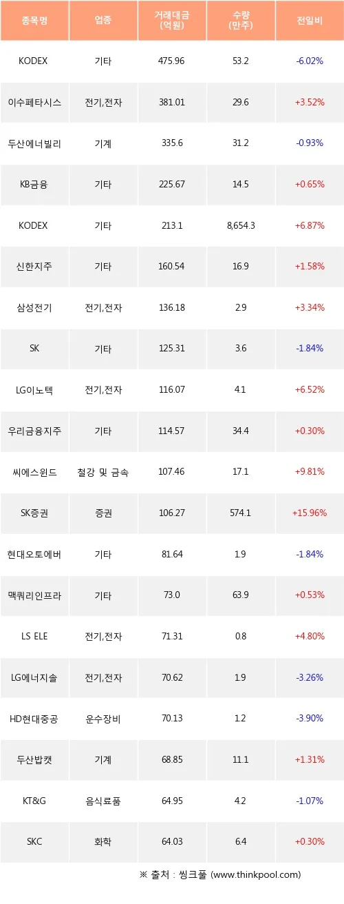 20일에는 화학 업종 5개 종목이 상위권에 진입했다. 두산에너빌리티·대한항공·한미반도체가 주요 매수 종목으로 나타났으며, 한화솔루션·S-Oil 등 화학주가 포함됐다.