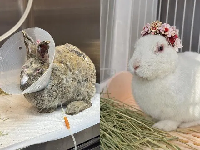 지난해 3월 경북 영덕군 산불에서 극심한 화상을 입고 구조된 토끼 '프릴'이 회복 후 입양을 기다리고 있다. 프릴은 구조 당시 양쪽 시력과 귀 일부를 잃었으며 임신 중이었으나 스트레스를 견디고 살아남았다.