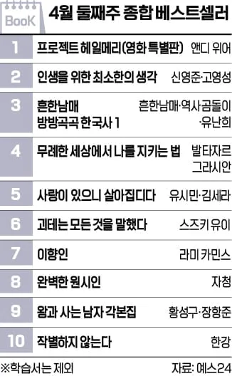인문 도서와 영화 연계 도서들이 4월 둘째 주 종합 베스트셀러 상위권을 장악했다. 앤디 위어의 <프로젝트 헤일메리(영화 특별판)>이 2주 연속 1위를 차지했으며, 신영준·고영성의 <인생을 위한 최소한의 생각>이 2위, 발타자르 그라시안의 <무례한 세상에서 나를 지키는 법>이 4위에 올랐다.