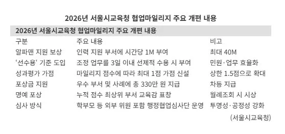 서울시교육청이 부서 간 협업을 활성화하기 위해 협업마일리지 인센티브를 대폭 확대한다. 인력을 지원한 부서에 시간당 1M·최대 40M의 마일리지를 부여하고, 3일 이내 업무 수용 시 추가 인센티브를 제공하는 '선수용' 기준을 신설했다.