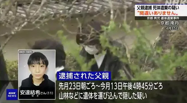 일본 교토부 경찰은 16일 초등학생 아다치 유키의 시신을 유기한 혐의로 양아버지 아다치 유우키(37)를 체포했다.
