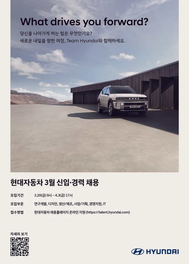 현대차가 20일부터 4월 3일까지 신입·경력 대규모 채용을 실시한다. 연구개발·디자인·생산·IT 등 전 부문 171개 공고가 열린다.