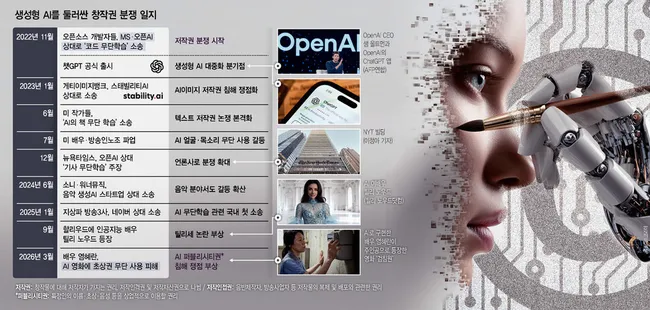 배우 염혜란이 동의 없이 AI 영화에 '등장'하고, 웹툰 작가들의 작품이 무단 학습되는 등 생성형 인공지능의 창작물 무단 학습 갈등이 전 분야로 확산되고 있다. 성우들은 TTS 기술 발전으로 일자리 50% 가까이 사라졌으며, 디즈니플러스 등 해외 플랫폼은 계약서에 '신개발 이용권' 조항을 삽입해 추가 보상 없이 음성을 AI 학습에 활용하고 있다.