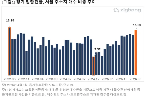 2026년 3월 경기도 집합건물을 매수한 수요 중 서울 거주자 비중이 15.69%로 전월 대비 1.17%포인트 상승했다. 2022년 6월 이후 약 3년 만에 최고 수준이다.