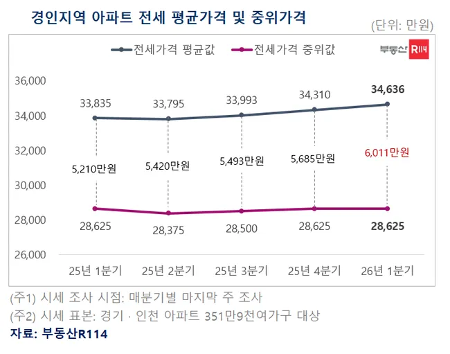 올해 1·4분기 경기·인천지역 아파트 평균 전세가격은 3억4636만원으로 집계되며 평균과 중위가격 격차가 6000만원을 넘어섰다. 중위가격은 2억8625만원으로 전분기와 동일한 수준을 유지한 반면, 평균가격만 상승하는 현상은 고가 신축과 인기 단지 중심의 가격 상승이 전체 평균을 끌어올리고 있음을 의미한다.