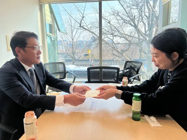 600일 고공농성을 벌였던 한국옵티칼하이테크 해고노동자 박정혜씨가 20일 청와대를 방문해 이재명 대통령에게 고용승계와 손해배상 문제 해결을 호소하는 자필 편지를 전달했다.