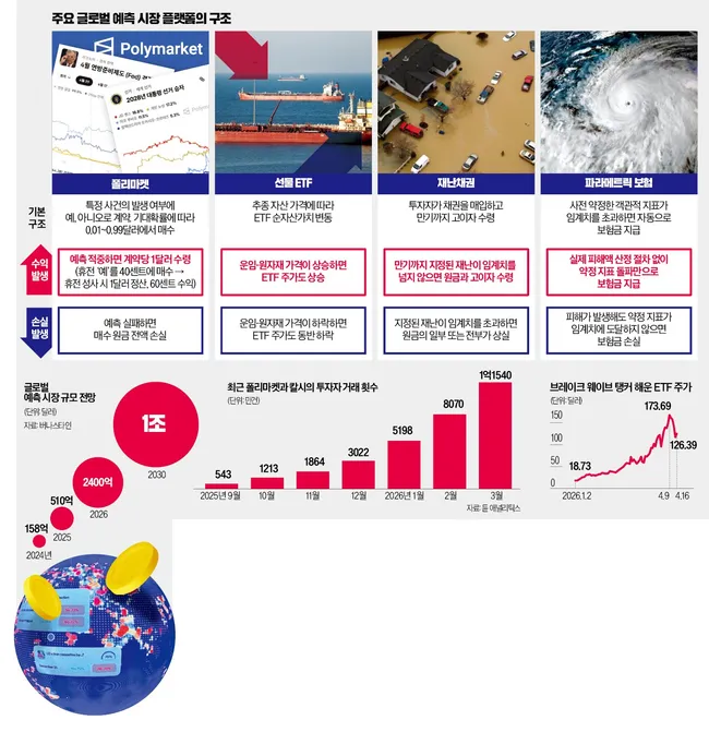 미국·이란 전쟁 종전부터 선거 결과까지 예측해 투자하는 예측 시장이 월가의 핵심 투자 인프라로 떠올랐다. 폴리마켓과 칼시 등 예측 시장 플랫폼의 거래 횟수는 1년 새 33.4배 급증했으며 거래액도 12배 늘어난 239억달러를 기록했다.