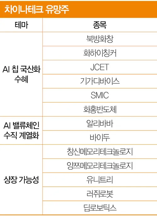 올해 중국 투자자의 주요 관심사는 CXMT, YMTC, 유니트리 등 주요 기업의 상장 여부와 AI 칩 국산화 진전이다. 중국 AI 칩 국산화율은 지난해 상반기 37% 수준으로 2~3년 전 20% 초반에서 의미 있게 개선됐으며, 북방화창, 화하이칭커, JCET 등이 국산화 수혜 기업으로 꼽힌다.