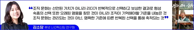 현대 조직도 구조조정이나 권력 교체 후 성과는 나오지만 냉소와 침묵이 늘어난다. 이때 성과만 강조하면 조직은 더 빨리 닳으며, 리더는 기준을 다시 정리해야 하는 시점에 놓인다. 조직 문화는 선언된 가치가 아닌 리더가 반복적으로 선택하고 보상한 결과로 형성되기 때문이다.