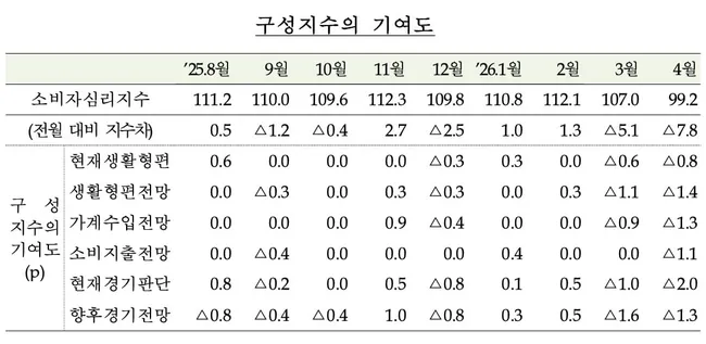 4월 소비자심리지수(CCSI)가 99.2로 전월 대비 7.8p 하락하며 지난해 4월 이후 1년 만에 100을 밑돌았다. 현재경기판단지수는 가장 큰 폭으로 하락했으며, 향후 경기전망과 생활형편전망 등도 일제히 하락했다.