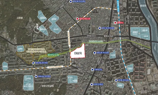 대상지는 방학천변 노후 저층 주거지 밀집 지역으로 북한산·도봉산과 인접하고 자연환경이 우수하다. 방학천을 따라 폭 15m 규모의 선형 녹지를 조성하고 도봉산 둘레길까지 이어지는 통합 산책로로 조성할 계획이다.