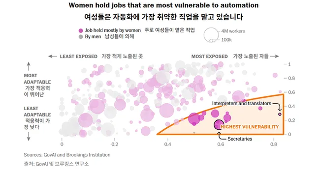 AI 노출도가 높으면서도 적응 가능성이 가장 낮은 직군의 86%가 여성이라는 연구 결과가 나왔다. GovAI와 브루킹스연구소의 공동 연구에 따르면 비서를 포함한 약 610만 명의 사무·행정직 노동자들이 AI에 가장 취약한 것으로 분석됐다.