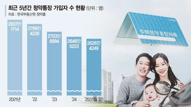 청약통장 가입자가 지난해 11월 말 기준 2626만명으로 전년 대비 22만명 이상 감소했다. 2021년 고점 대비 210만명이 이탈했으며, 특히 당첨 가능성이 높은 1순위 가입자마저 매년 50만명 이상 빠져나가고 있다.
