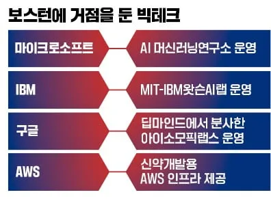 마이크로소프트, IBM, 아카마이 등 빅테크 기업들이 보스턴 지역에 AI 연구소를 설립하고 제약사들과 협력을 확대하고 있다. 사노피는 'AI 퍼스트' 전략으로 신약 개발 전 과정에 AI를 적용하며 제조 공정의 불량을 80% 이상 사전 차단하는 성과를 냈다.