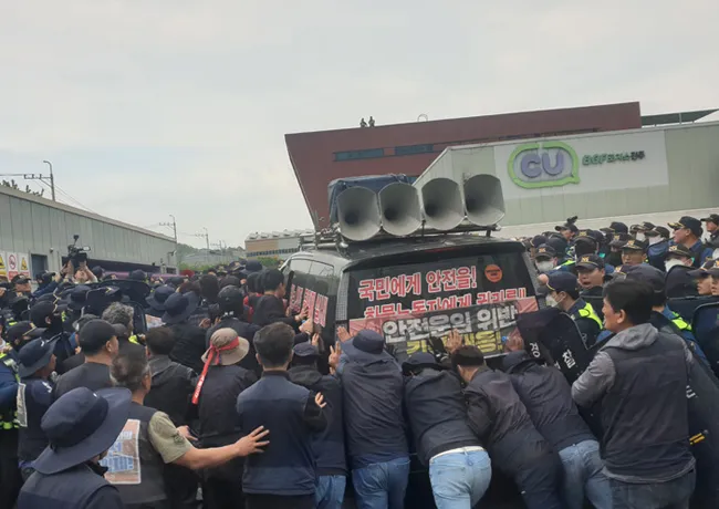 경남경찰청 광역수사대는 지난 20일 진주시 CU 물류센터 앞 화물연대 집회 현장에서 차량으로 조합원을 치어 1명을 숨지게 한 비조합원 A씨(40대)를 구속송치했다.