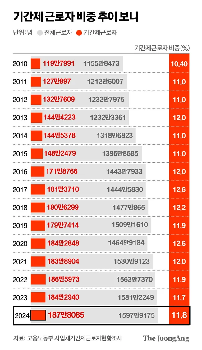 고용노동부 조사에 따르면 2024년 말 기준 기간제 근로자 비중은 11.8%로 2010년(10.4%)보다 소폭 상승했으며, 정규직 전환율은 8.6%에 그쳐 제도의 실효성이 미미한 것으로 나타났다. 한국노동연구원 분석에서도 비정규직의 정규직 전환 비율이 2009년 27.9%에서 2018년 14.9%로 급락했다.