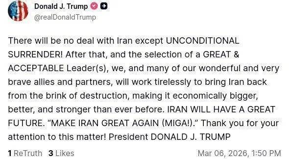 트럼프 “이란과의 협상, 무조건 항복 외엔 없다”
