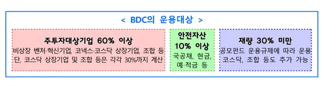 BDC는 자산 총액의 60% 이상을 비상장 벤처·혁신기업 등에 의무 투자해야 하며, 증권 매입뿐 아니라 금전 대여 방식도 허용된다. 가장 큰 특징은 '환금성'으로, 설정 후 90일 이내에 코스닥시장에 상장해 투자자들이 증권사 MTS·HTS를 통해 실시간으로 펀드 지분을 사고팔 수 있다.
