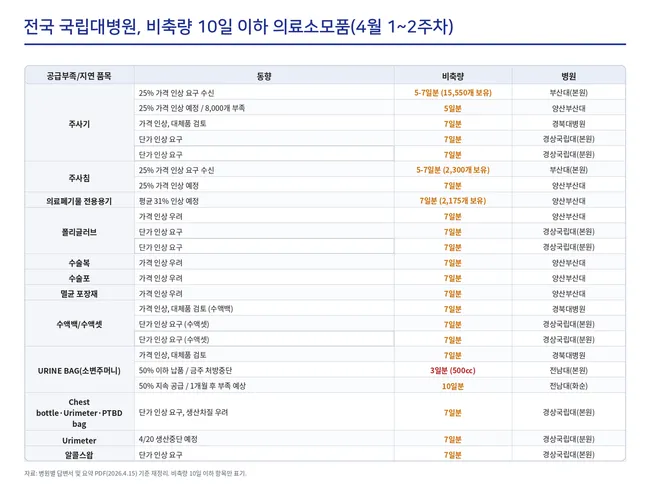 전남대병원의 중증 환자용 500cc 소변주머니 납품량이 발주량의 50% 이하로 급감해 재고가 3일치에 불과했고, 경상국립대병원 분원은 흉관 배액병 제조사로부터 생산 중단 통보를 받았다. 병원들은 재고 부족에 더해 주사기·주사침 25% 인상, 의료폐기물 용기 22.5% 연속 인상 등 가격 급등으로 이중고를 겪고 있다.