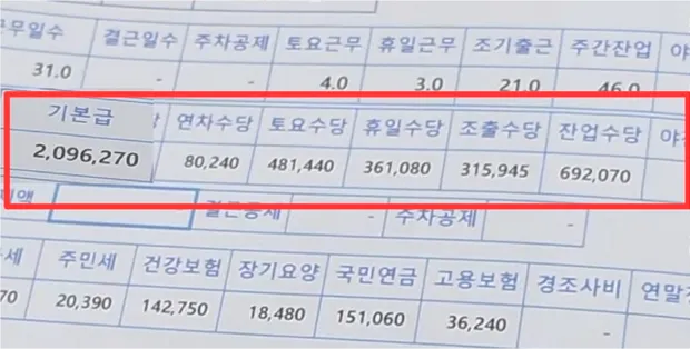 해당 노동자는 31일 동안 하루도 쉬지 않고 평일 조기 출근 21시간, 주간 잔업 46시간을 포함해 일했다. 실수령액은 소득세와 각종 보험료를 공제한 345만4155원이었다.