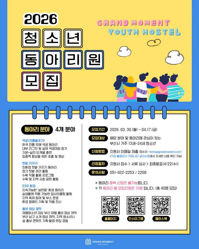 부산 남구 그랜드모먼트 유스호스텔이 17일까지 청소년동아리 신규 회원 40명을 모집한다. 국궁, 텃밭 가꾸기, ESG 환경, 지역 홍보 활성화 등 4개 분야로 동아리별 10명씩 선발한다.