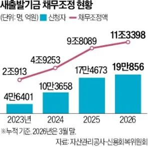 정부가 새출발기금과 새도약기금을 통해 탕감한 빚 규모가 13조원을 넘어섰다. 지원 자격 확대로 신청자가 급증하면서 새출발기금 채무 조정 약정액은 11조3398억원, 새도약기금 연체 채권 매입액은 1조7591억원에 달했다.