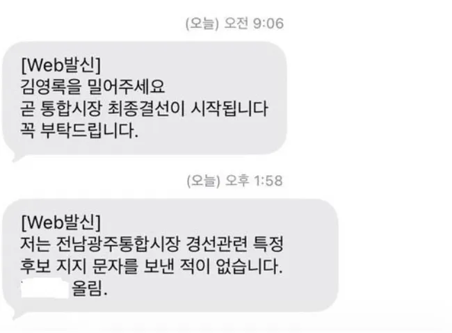 더불어민주당 전남광주통합특별시장 경선에서 시민 명의가 도용돼 특정 후보 지지 문자가 대량 발송되는 사건이 발생했다. 민형배 후보 캠프는 12일 광주시 간부 A씨의 명의가 도용돼 김영록 후보 지지 문자와 해명 문자가 반복적으로 발송됐다고 주장하며 선거관리위원회와 경찰에 신고·고발 조치할 예정이라고 밝혔다.